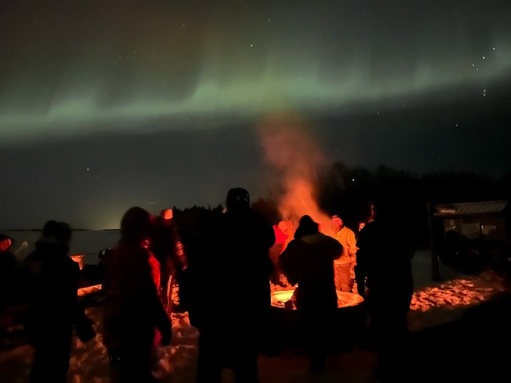 You can relax by the fire, take photos, or simply enjoy the quiet winter landscape. Guests are invited to take a short walk around the small island of Tervakari — a peaceful circular stroll surrounded by sea ice. On clear nights, the stars shine bright, and if conditions align, the Northern Lights may appear above the frozen bay. Before returning to land by sled, you warm up in the grill hut with a hot drink and grill sausages over the fire — a classic Nordic evening tradition. The whole experience is calm, scenic and ideal for anyone who wants a light